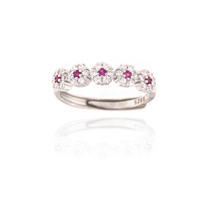 Anello in argento e zirconi rosso rubino fiori