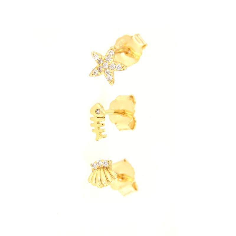 Orecchini a tris in argento dorato e zirconi stella marina lisca conchiglia